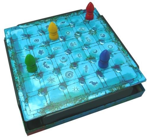 ボード上の各マスには魔法の印が描かれています。各プレーヤーのコマは4つの隅のいずれかに置きます。この時プレーヤーのコマの下には磁石で鉄の球が付いています。