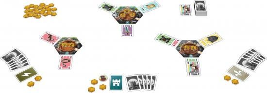 3つのフェニックスの巣にプレイ人数−1枚の得点チップを置きます。この得点チップを奪い合います。手番プレーヤーは3つの巣の中から1つを選び、その巣に描かれている自分のマークの前に手札から1枚のカードを選んでおきます。その後、山札からカードを1枚引いて次のプレーヤーの手番となります。こうして、全員が3つの巣に2枚ずつカードを置くまで続けます。